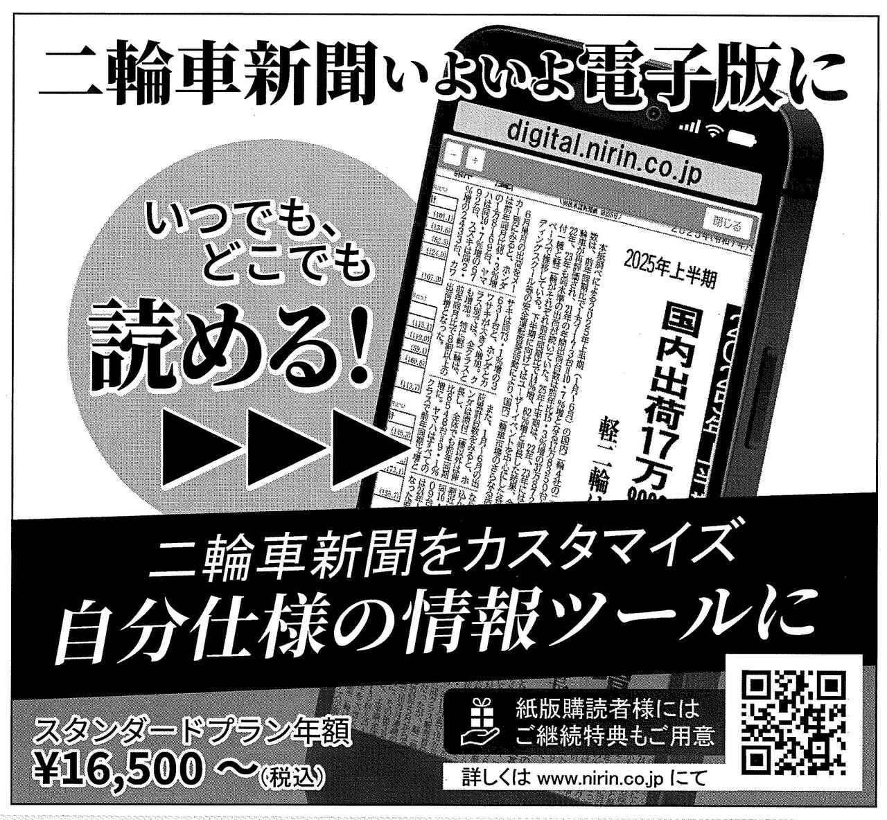 二輪車新聞は11月7日発行の第3422号(ジャパンモビリティショー2025特集号)より、正式に電子版をリリースいたします。一部プランを除き、2025年5月までのバックナンバーが閲覧でき、記事検索やクリップ機能をご利用いただけるなど、便利な情報ツールとなっております。